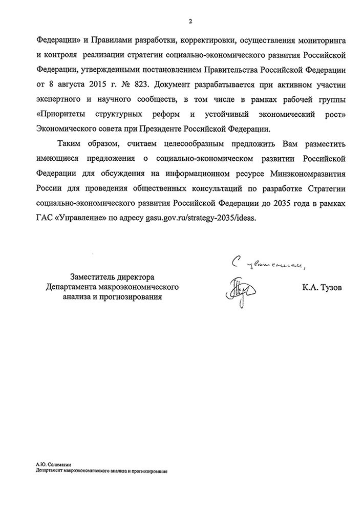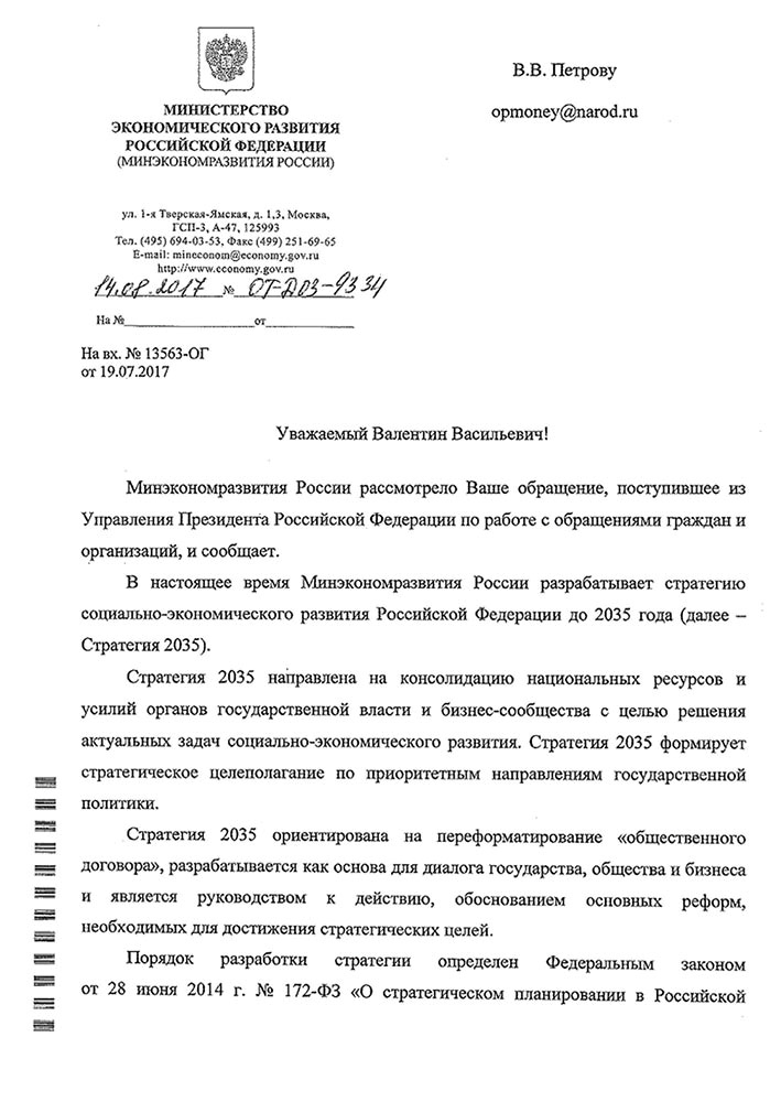 Книга была разослана по многим адресам. Печатный экземпляр отправлен и В. В. Путину. Электронный экземпляр книги переслан из администрации В. В. Путина в Министерство Экономического развития, откуда пришёл такой ответ.
