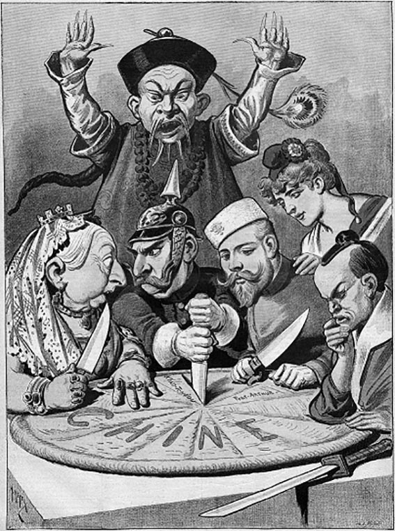 Французская политическая карикатура конца 1890-х. Пирог олицетворяет Китай, который делят между собой английская королева Виктория, Вильгельм II, император Германский (спорящий с Викторией о куске пирога, вонзив при этом в пирог кинжал в знак своих агрессивных намерений), Николай II, император Российской империи, присматривающий особый кусок, французская Марианна (представленная не принимающей участия в разделении пирога и приближённой к Николаю II как знак Франко-русского союза) и японский император Мэйдзи, глубоко задумавшийся, какие куски ему взять. Позади них представитель двора Цин, поднявший руки, чтобы остановить их, но безуспешно. Карикатура представляет отношение глав перечисленных империй к Китаю в то десятилетие.