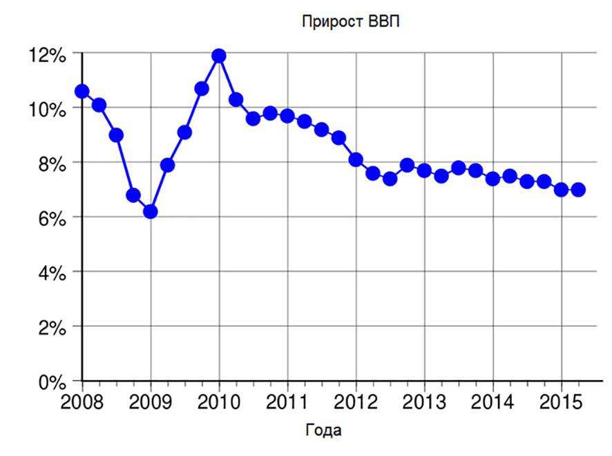 И в дальнейшем Китай показывал стабильно высокий прирост ВВП, опережая по этому показателю развитые страны более чем в 2 раза.