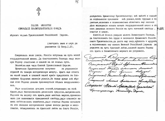 7-8 марта Синод издал определение, по которому всему российскому духовенству предписывалось: «во всех случаях за богослужениями вместо поминовения царствовавшего дома возносить моление «о Богохранимой державе Российской и благоверном Временном правительстве ея». 9 марта Синод обратился с посланием «К верным чадам Православной Российской Церкви по поводу переживаемых ныне событий».
