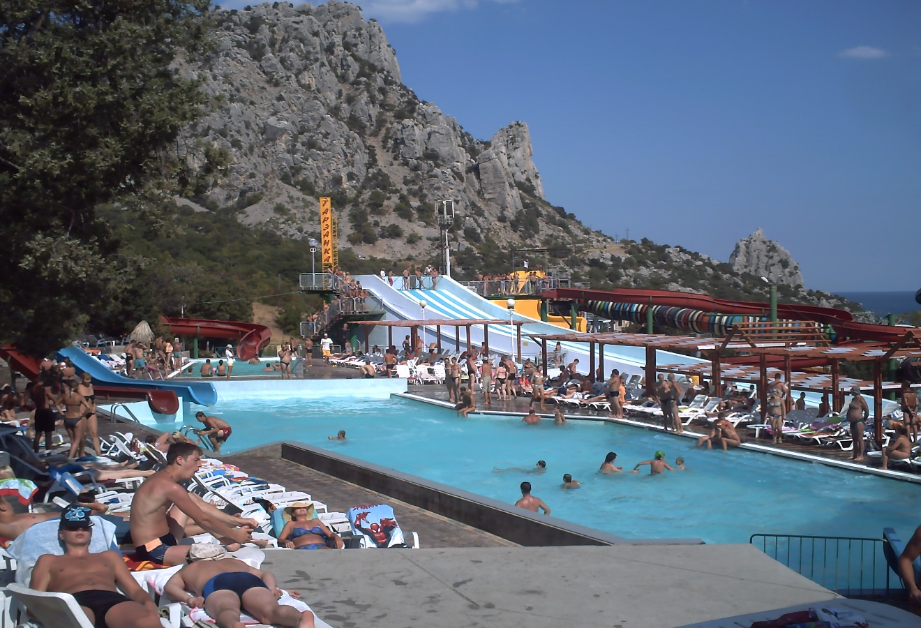 Четверг был выбран нами для посещения аквапарка, потому что это будний день. И хоть народу было одинаково большое количество в любой день недели, всё-таки в выходные могли прийти ещё и местные, а этого никто из нас не хотел. Аквапарков в Крыму было, если я не ошибаюсь, пять: в Судаке, Севастополе, Алуште, Симеизе и Евпатории. Ехать в Судак, Севастополь, а особенно в Евпаторию было неоправданно далеко. В Симеизе мы уже были неоднократно, мне лично хотелось поехать в Алуштинский аквапарк, тем более, что мой брат там побывал, а я – нет, и мне хотелось восполнить утраченные позиции. Но мама, наслушавшись своих коллег, сообщила нам о том, что там, якобы нет деревьев… Мне, если честно, деревья были не так важны, ведь в степном Бердянском аквапарке их вообще не было, но решили ехать в Симеиз. Я несильно расстроилась, аквапарк – это в любом случае весело, а дорога, ведущая в Симеиз, гораздо более интересна, чем отрезочек до Алушты. И вот по узким улочкам мы ехали наверх, необыкновенные виды Гурзуфа, которые мы не заметили, когда сюда въезжали, поразили нас с новой силой. И мне пришла в голову мысль: «Мне нужна гурзуфская прописка и можно даже без подходящего чела». Боже мой! Как же я скучала по этим местам: Никита, Массандра, Ялта, Ливадия, Дворец Александра III, Курпаты и пансионат «Дружба», Мисхор, Гаспра, Ай-Петри. С одной стороны, я даже жалела, что была в этих местах лишь в далёком 1998 году, ещё несмышленым ребёнком, но потом подумала и поблагодарила Бога за фотографии, видеокассеты и мою память, которая всё же что-то помнила с того времени, когда мой брат не помнил ничего вообще. Через час, мы уже были в Симеизе, о да, тут мы могли бы отдыхать. Улочки узкие, рынок стоял прямо на проезжей части, людей были тучи, мы увидели знаменитую Аллею кипарисов или Аллею голых мужиков, которых там стояло много (мраморных конечно!)