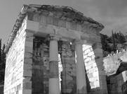 У подножия храма Аполлона, стоящего на высокой террасе, сложенной из массивных каменных блоков, возвышаются колонны стои афинян и камни с записанными именами дарителей. Перед фронтоном храма высились алтарь хиосцев и бронзовый треножник, поставленный греческими городами после победы над персами при Платеях.