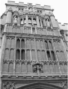 Колледж Крайст-Черч был основан в 1529 г. фаворитом Генриха VIII кардиналом Вулси на месте древнего аббатства св. Фредесвинды, легендарной основательницы Оксфорда. Коллегиальная церковь Крайст-Черч сохранилась со времен норманнов и представляет собой мощную трехнефную постройку с небольшими полукруглыми окнами, разделенными прямоугольными контрфорсами. Центр треугольного восточного фасада занимает большое полукруглое окно, крыша опоясана зубчатым парапетом. У западного фасада возвышается приземистая квадратная башня с восьмигранными контрфорсами по углам, завершающимися небольшими башенками. Трехэтажные здания колледжа унизаны множеством башенок, напоминая фантастические шкатулки, на скате крыши красуются сдвоенные мансардные окна под треугольным фронтоном. Над входом в колледж возносится двухъярусная башня Том-Тауэр, окна которой украшены резным декором. Она была построена в 1681 г. Кристофером Реном, строителем собора св. Павла в Лондоне. В ее колокол Биг-Том звонят ежевечернее, раньше это служило сигналом к закрытию городских ворот.