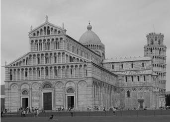 Беломраморный собор в романском стиле был заложен в 1063 г. Его начал строить архитектор Бускето в форме латинского креста. Идеальные пропорции сделали собор одним из самых выдающихся произведений итальянской архитектуры. Фасад, облицованный чередующимися рядами белого и черного мрамора, увенчанный треугольным фронтоном, разделен на четыре аркадных яруса, обрамленных рядом колонн. Полукруглые порталы чередуются арками с медальонами. Широкое основание бокового фасада несет более узкую верхнюю часть с глухой полукруглой аркадой, завершающуюся двухскатной крышей, создавая характерный профиль романского храма. Над средокрестием на мощном барабане с арочной галереей возвышается вытянутый купол с высоким фонарем. Интерьер собора поражает своими масштабами и напоминает о былом величии Пизы, пять основных и три поперечных нефа разделены аркадами, которые поддерживают 68 подлинных античных круглых мраморных колонн, привезенных из различных храмов и потому несколько отличающихся друг от друга по высоте, над ними проходит галерея сдвоенных арок трифория. Центральный неф собора перекрыт плоским кессонированным позолоченным деревянным потолком, а боковые – каменными сводами. Здесь находится ряд произведений искусства, среди которых особенно выделяются кафедра в готическом стиле, созданная Джованни Пизано и гробница императора Генриха VII (1315 г.)