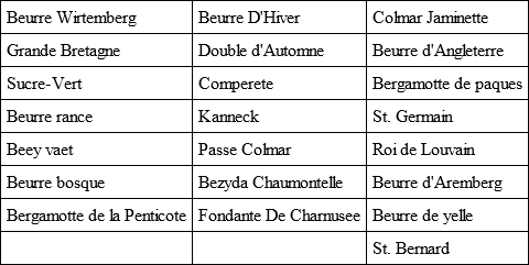 I next proceeded to the duke d'Aremberg's, which is situated at a short distance from Louvain, having a letter of introduction from Sir R. Adair, to his highness, whom I found particularly attached to botany and horticultural pursuits. The kitchen garden here is very extensive, and large quantities of vegetables are cultivated; several pits for the growth of the pine and peach were also in this establishment; but the collection of choice pears pleased me more than any I had previously seen, and certainly produced very fine fruit; the following sorts were pointed out to me as the best deserving of cultivation, which were then in the fruit room.