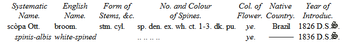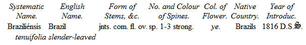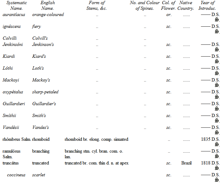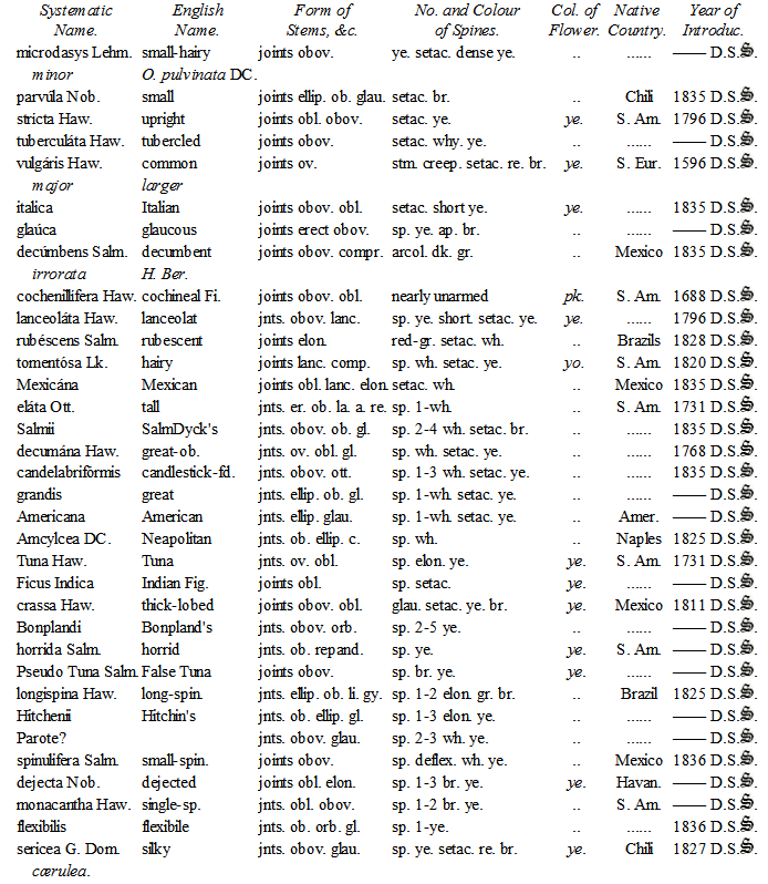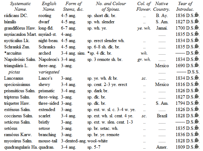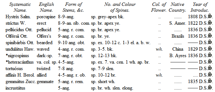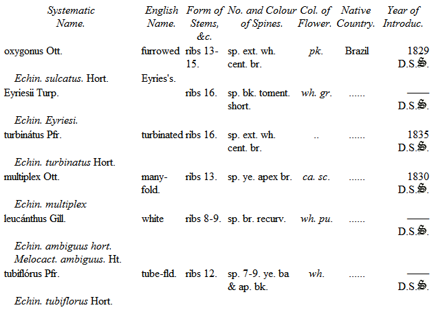 Mr. Hitchen of Norwich devoted much attention to their cultivation, and certainly had formed the best collection at that time in England. Being under the necessity of breaking up his establishment, he disposed of his Cacteæ and other succulent plants to Mr. Mackie, Nurseryman, of Norwich, from whom the Duke of Bedford purchased a considerable number in the spring of 1834. Since that period His Grace's collection has been increased by the liberality of several continental collectors during my tour; and I feel it but justice more particularly to mention M. Otto, of Berlin, who contributed many valuable species, and M. Lehmann, of Dresden, from whom I have also received about two hundred. M. Seitz of Munich, M. Bosch of Stuttgard, Mr. Booth, of Flottbeck Nursery, Hamburgh, and Professor Lehmann, as well as the Curators of the Edinburgh, Glasgow, and Dublin College Botanic Gardens, have added greatly to the collection; and with some recent acquisitions from Mr. Tweedie, of Buenos Ayres, obtained through the intervention of Lord Edward Russell, have now rendered this collection superior to any one existing in this country, and little inferior to any on the continent.