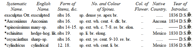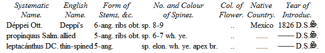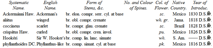 The cultivation of the Cacteæ possesses considerable advantage over most of the hothouse plants, requiring little room, a matter in general of considerable importance where space is necessarily limited. They will also flourish and flower in a lower temperature than most other hothouse plants: most of the species will not require to be kept in a higher degree of heat than from 45° to 50°; some of the South American species, however, succeed best in a higher temperature. They should be kept rather in a dry state, and water used but sparingly, as these plants are very impatient of wet. The houses most suitable for the cultivation of this singular tribe should be so glazed as to effectually exclude the intrusion of water. In the extensive range of plant-houses now erecting at Woburn Abbey, one is intended to be exclusively devoted to the cultivation of Cacteæ. The soil most suitable for their growth is a mixture of sandy-peat, leaf-mould and lime rubbish, well incorporated together.