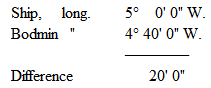 The difference would be twenty minutes of longitude, and the difference in time between the two places one degree apart is four minutes. Reduce this to seconds: —