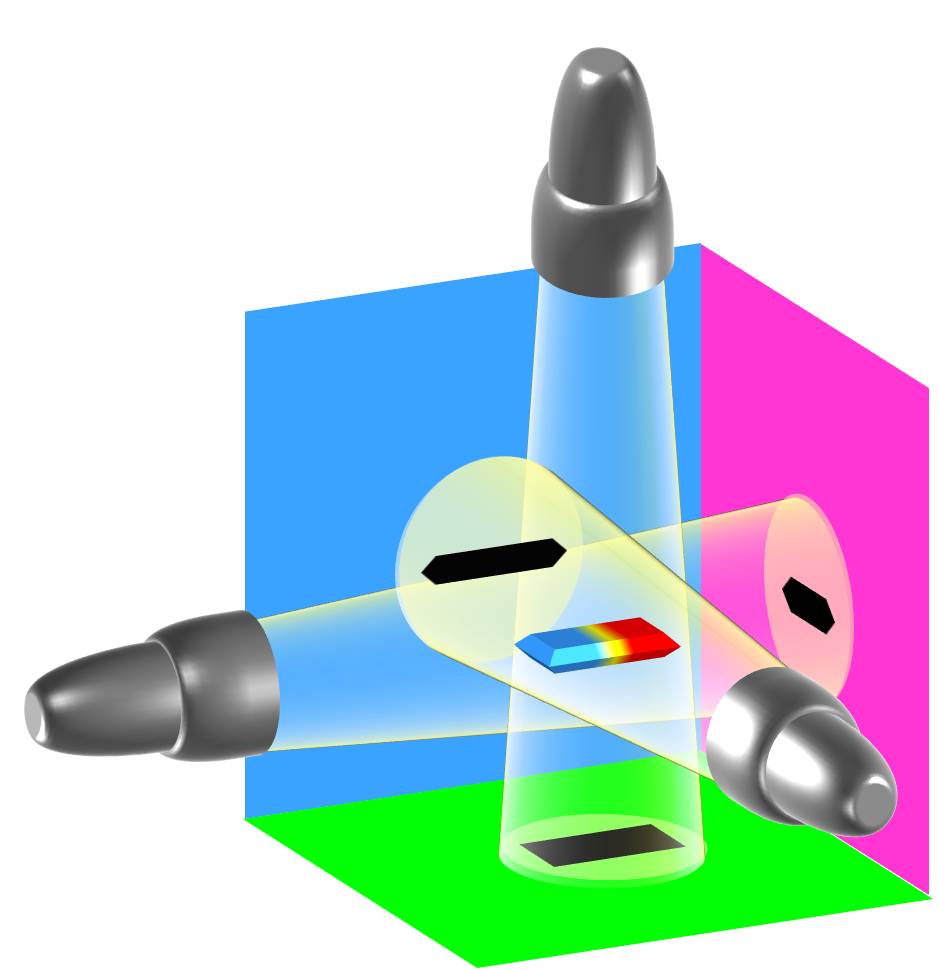 Теперь давайте представим, что зелёная плоскость ─ это нижняя поверхность (пол), синяя плоскость ─ это задняя поверхность (дальняя стена), а розовая плоскость ─ это правая поверхность (боковая стена).