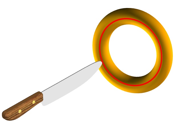 Ведь если следовать такому утверждению, то половинка бублика должна иметь, соответственно, половину дырки! А такого вообще не может быть! Или, например, можно попросить родителей разрезать бублик вдоль, или в плоскости бублика, или поперёк плоскости бублика. И в том, и в другом случае получаться две половинки бублика, каждая со своей дыркой!