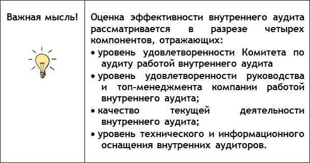 Таким образом, применение показателей оценки внутреннего аудита позволит заинтересованным сторонам определиться с тем, насколько эффективными и экономичными являются для компании мероприятия внутреннего аудита.