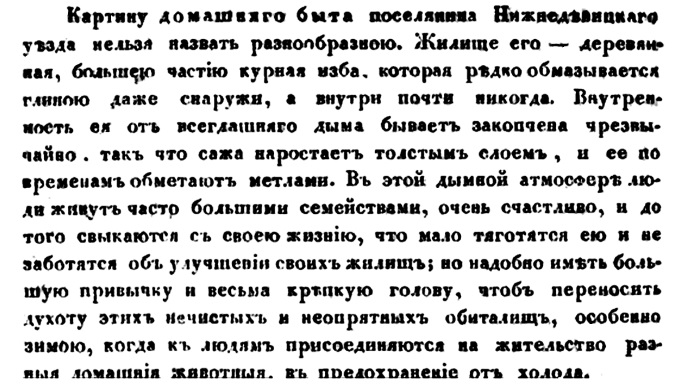 Вот, к примеру, Рафаэль Барберини (1565 г.): «Дома в этом городе, как и в прочих городах и селениях, небольшие и дурно расположены, без всякого удобства и надлежащего устройства. Во-первых, большая изба, где едят, работают, одним словом, делают все; в ней находится печь, нагревающая избу; и на этой печи обыкновенно ложится спать все семейство; между тем не придет им в голову хотя б провести дымовую трубу; а то дают распространяться дыму по избе, выпуская его только чрез двери и окна, так что немалое наказание там оставаться»15.