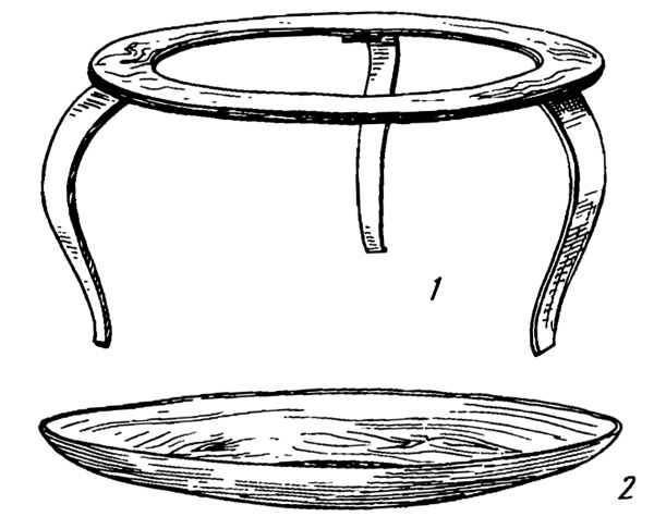Предметы очага. Новгород. XII в. 1 – таганок, 2 – сковорода