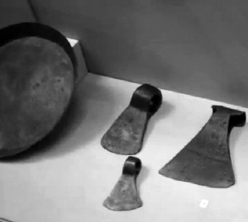 Ипатьевский клад. Найден в 1969 году при раскопках в Ипатьевском переулке г. Москвы. Состоит из снаряжения и утвари состоятельного горожанина XVI–XVII вв. Слева – сковорода, являвшаяся тогда обычным предметом обихода. Из экспозиции Музея археологии Москвы. Фото автора
