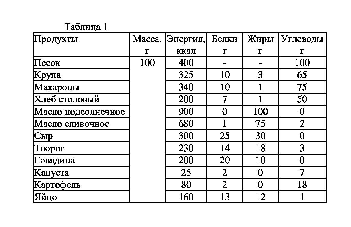 Белки, жиры и углеводы это основа любого продукта питания. В таблице 1 представлен базовый набор из 12-ти продуктов питания, минимально достаточный для полноценного питания человека длительное время.