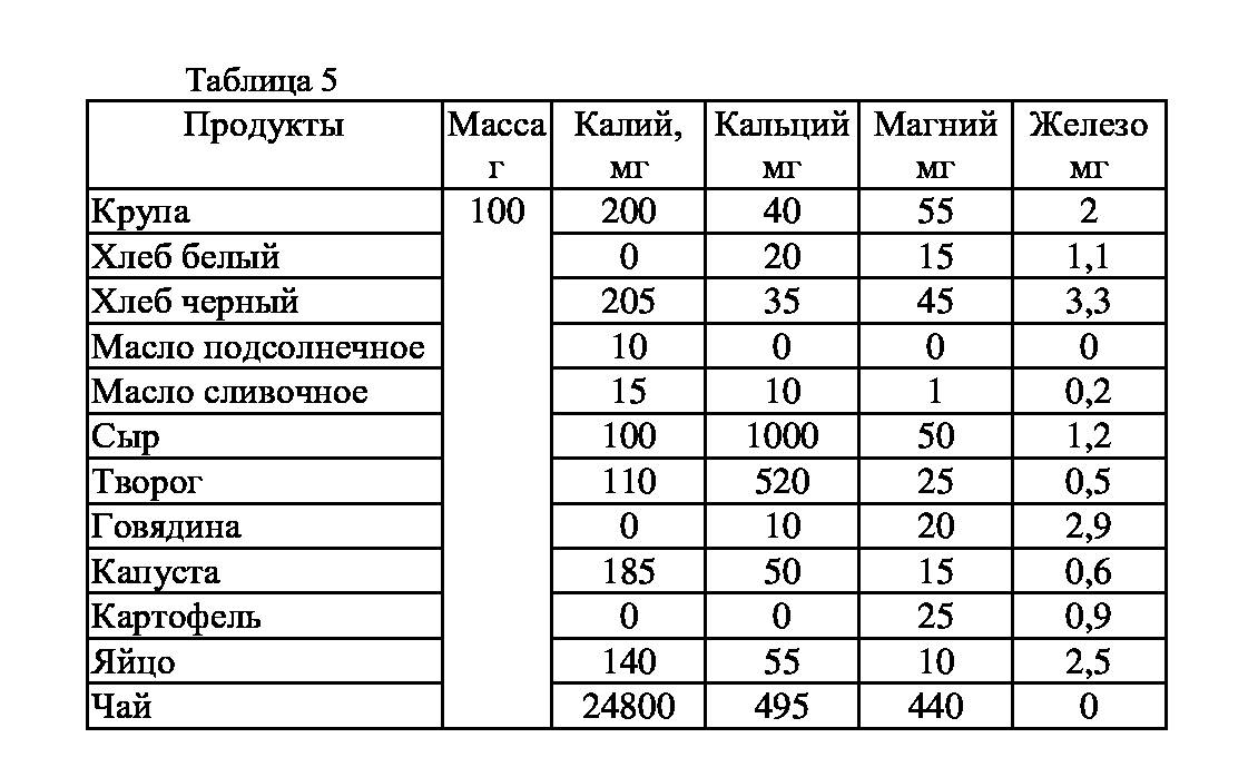 Вышеперечисленные макроэлементы (калий, кальций, магний) очень важны для здоровья человека. Их содержание в 100 граммах продуктов базового набора представлены в таблице 5.