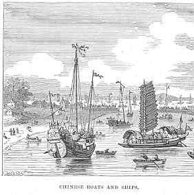 A large Chinese junk rises high out of the water; there are two or more decks aft above the main-deck, painted and carved with various devices; and the cabins are often luxuriously furnished according to Celestial tastes. If you look at any representation of a junk, you will notice that the rudder is very broad, resembling somewhat the rudder of a canal barge. In spite of its primitive look, it has, after all, something picturesque about it; but we fancy that we would rather contemplate it in a picture than sail in one across the Atlantic.