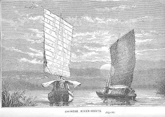 The river-life of China is very curious. Quite a large proportion of the people spend their whole lives on the water, while many who are employed during the day on land sleep in boats on the various rivers. This condition of things corresponds in some degree to that described by Captain Marryat in that fine old story “Jacob Faithful,” in the early chapters of which we get diverting glimpses of life on board a Thames lighterman. But the river population of China is still more absolutely aquatic in manner of life than the Thames barge-folk. The boats in which this class of the population live have an awning of bamboo and matting fore and aft, which is removed by day and raised at night. At sundown the boat-people anchor their craft in rows to stakes, thus forming boat-terraces as it were. When business grows slack at one part of the river, the master of the boat moves up or down stream to some other part. From the shape of these boats, resembling somewhat the half of an egg cut lengthwise, they are called in the Chinese language “egg-boats.” A large family will sometimes pack itself into an egg-boat not much more than twelve feet long and six broad.
