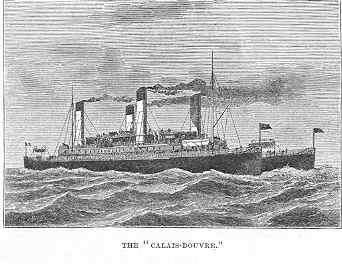 Most persons who have crossed from Dover to Calais, or vice versa, by the Calais-Douvre mail packet, will bear witness both to the comfort and speed of that vessel. Up to this she has proved the most perfect form of steam-ship yet constructed for the purpose required. The Calais-Douvre is built somewhat upon the same principle as the Castalia, but differs from that vessel in that whereas the latter was two half-ships joined together, each twin-portion of the Calais-Douvre is a perfect ship in itself. The result has been, that while the Castalia was a failure, the Calais-Douvre has proved a distinct success. She is three hundred feet in length and sixty feet in breadth; her tonnage is two thousand, and her water-draught only six feet, so that she can enter Calais Harbour at even a low tide. Two transverse iron girder bulk-heads unite the two hulls of the vessel; and her steering apparatus is so simple, and at the same time so effective in construction, that one wheel is usually sufficient to work it. She makes the passage from Dover to Calais usually in an hour and a half; but in very fine weather we ourselves have crossed in less than that time. With the maximum rate of speed, the Calais-Douvre has attained the minimum amount of pitching and rolling yet secured by any Channel boat. Her saloons, cabins, and decks are spacious and handsomely appointed, so that the Channel passage in this vessel is made under as favourable conditions for bad sailors as any sea-passage can be.