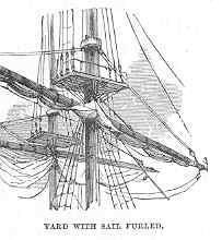 Reef-points are the little ropes which may be observed hanging in successive rows on all sails, by means of which parts of the sails are gathered in and tied round the yards, thus reducing their size in stormy weather. Hence such nautical expressions as “taking in a reef,” or a “double reef,” and “close reefing,”—which last implies that a sail is to be reduced to its smallest possible dimensions. The only further reduction possible would be folding it up altogether, close to the yard, which would be called “furling” it, and which would render it altogether ineffective. In order to furl or reef sails, the men have to ascend the masts, and lay-out upon the yards. It is very dangerous work in stormy weather. Many a poor fellow, while reefing sails in a dark tempestuous night, has been blown from the yard into the sea, and never heard of more. All the yards of a ship, except the three largest, can be hoisted and lowered by means of halyards. The top-gallant masts can also be lowered, but the lower-masts, of course, are fixtures.
