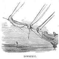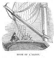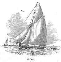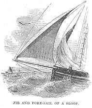 The masts, yards, and sails of a sloop are as follows:– As has been already said, one of the distinctive peculiarities of a sloop is, that it has only one mast. This mast is sometimes formed of one stick, sometimes of two; the second, or top-mast, being fastened to the top of the lower mast by cross-trees and cap, in such a way that it may be hoisted or lowered at pleasure. A sloop has usually four sails,—a mainsail, fore-sail, gaff, and jib. The main-sail is behind the lower mast. It reaches from within a few feet of the deck to the top of the lower mast, and spreads out upon two yards towards the stern or after part of the ship, over which it projects a few feet. The lower yard of the main-sail is called the boom, and the upper the main-sail yard. This is by far the largest sail in the sloop. Above it is spread the gaff, which is comparatively a small sail, and is used when the wind is not very strong. The fore-sail is a triangular sheet, which traverses on the fore-stay; that is, the strong rope which runs from the lower mast-head to the bow, or front part of the sloop. On the bowsprit is stretched the jib, another triangular sail, which reaches nearly to the top of the lower mast. The only sail that rises above the lower mast is the gaff. In stormy weather this sail is always taken down. If the wind increases to a gale, the jib is lowered and lashed to the bowsprit.
