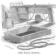 Miscellaneous.—The openings in the decks are called hatches; the stair-cases which descend to the cabins are called companions. The pulleys by which sails, etcetera, are hoisted, are named blocks. Braces are the ropes by which sails are fixed tightly in any position. Hauling a rope taut, means hauling it tight. The weather side of a ship means the side which happens to be presented to the wind; the lee side, that which is away from the wind, and, therefore, sheltered. The starboard side means the right side, the larboard signifies the left; but as the two words resemble each other, the word port is always used for larboard to prevent mistakes in shouting orders. Heaving the lead is the act of throwing a heavy leaden plummet, with a line attached, into the sea to ascertain its depth. It is thrown from the chains as far as possible ahead of the ship, so that it may reach the bottom and be perpendicularly beneath the man who heaves it when the ship comes up to the spot where it entered the water. A peculiar and musical cry is given forth by the heaver of the lead each time he throws it. The forecastle is the habitat of the ordinary sailors, and is usually in nautical parlance termed the foge-s’l.