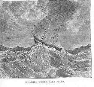 Should the gale increase, a reef is taken in the main-sail. One, two, three, and sometimes four reefs are taken in, according to the violence of the storm; when the last reef is taken in, the sloop is under close-reefed main-sail. Increased violence in the storm necessitates the taking in of the main-sail and lying-to under the fore-sail, or a part of it. Lying-to is putting the sloop’s head to the wind, and placing the helm in such a position that it tends to turn the vessel in one direction, while the gale acting on the fore-sail tends to force it in another, and thus it remains stationary between the two opposing forces. Many vessels thus lie-to, and ride out the severest storm. Sometimes, however, a dreadful hurricane arises, and compels vessels to take in all sails and “scud under bare poles”—that is, drive before the wind without any sails at all; and it is at such seasons that man is forced to feel his utter helplessness, and his absolute dependence on the Almighty. Of course, there are slight variations in the rig of sloops—some have a square-sail, and some have a flying-jib; but these are not distinctive sails, and they are seldom used in small craft.