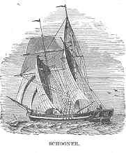 This is the most elegant and, for small craft, the most manageable vessel that floats. Its proportions are more agreeable to the eye than those of any other species of craft, and its rig is in favour with owners of yachts,—especially with those whose yachts are large. The schooner’s distinctive peculiarities are, that it carries two masts, which usually “rake aft,” or lean back a good deal; and its rig is chiefly fore-and-aft, like the sloop. Of the two masts, the after one is the main-mast. The other is termed the fore-mast. The sails of a schooner are—the main-sail and the gaff, on the main-mast; the fore-sail, fore-top-sail, and fore-top-gallant-sail (the two last being square sails), on the foremast. In front of the fore-mast are the staysail, the jib, and the flying-jib; these last are triangular sails. If a schooner were cut in two in the middle, cross-wise, the front portion would be in all respects a sloop with a square top-sail; the stern part would also be a sloop, minus the bowsprit and the triangular sails before the mast. Schooners sometimes carry a large square-sail, which is spread when the wind is “dead aft.” They are much used in the coasting-trade; and one of their great advantages is that they can be worked with fewer “hands” than sloops of the same size.