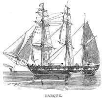 This vessel is next in size larger than the brig. It does not follow, however, that its being larger constitutes it a barque. Some brigs are larger than barques, but generally the barque is the larger vessel. The difference between a barque and a brig is that the former has three masts, the two front ones being square-rigged, and the mizzen being fore-and-aft rigged. The centre mast is the main one. The rigging of a barque’s two front masts is almost exactly similar to the rigging of a brig, that of the mizzen is similar to a sloop. If you were to put a fore-and-aft rigged mizzen-mast into the after part of a brig, that would convert it into a barque.