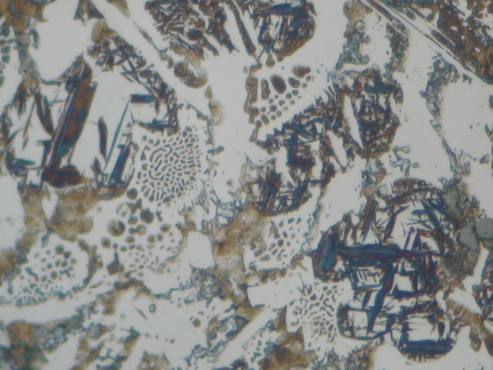 Нелинейность заключается здесь в замене всего лишь одного слова в каждой строке, но от этого некое абсурдно-фрейдисткое повествование превращается в описание действительного процесса закалки чугуна. На рисунке представлена структура закаленного чугуна (x500).