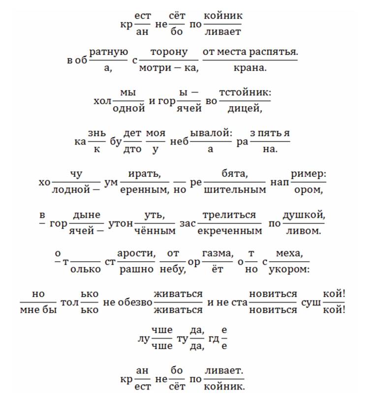 В данном случае два различных текста возникают в зависимости от того, какой вариант прочтения будет выбран читателем: по числителю («крест несёт покойник в обратную сторону от места распятья…») или по знаменателю («кран небо поливает в оба, смотри-ка, крана…»). итатель также может выбрать свой собственный маршрут движения текста в данном стихотворении, не опираясь на варианты, предложенные автором.