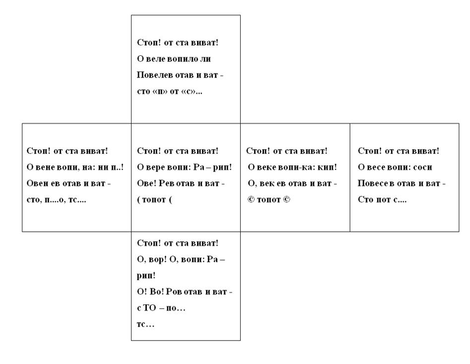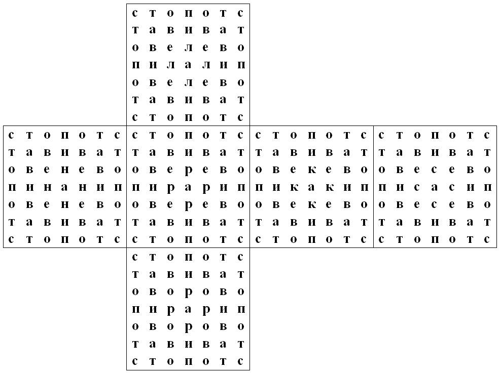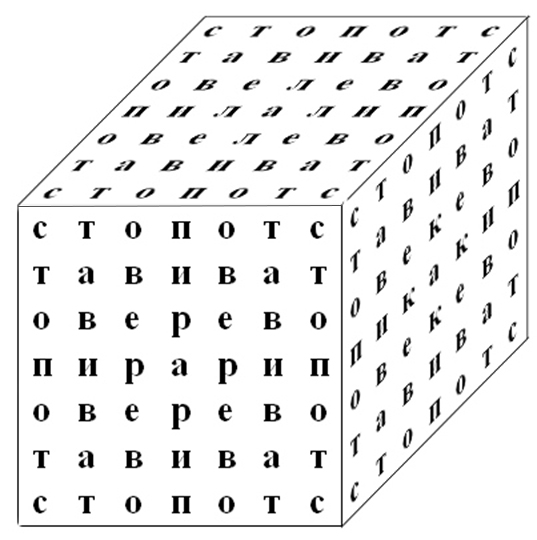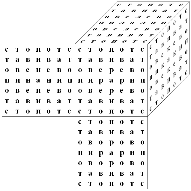 Каждая грань куба читается одинаково со всех четырех углов квадрата в любую сторону. В основании каждой грани куба лежит тот же порядок букв, что и у соседней грани.