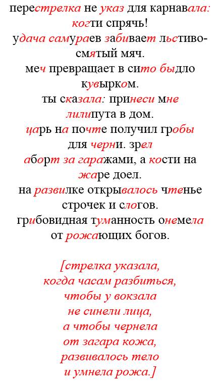 Это стихотворение можно читать как построчно, так и в нескольких других вариантах. Не следует забывать, что каждый вариант несет собственную смысловую нагрузку и не всегда представляет литературное произведение в традиционном представлении. В некоторых местах необходимо проявить фантазию и снисходительность, чтобы понять и простить автора.