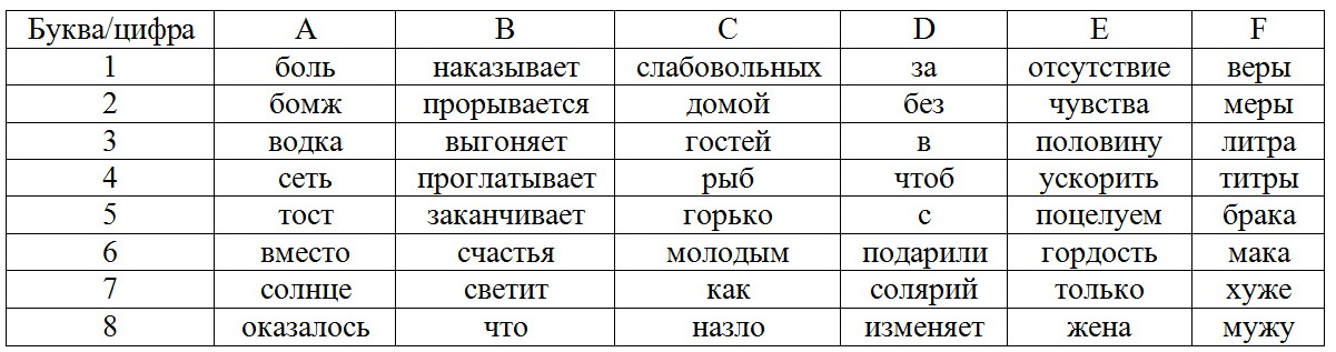 [Этот вариант необходимо читать с любым нерусским акцентом. Отсутствие пробелов между двумя составляющими строки указывает на то, что два слова из таблицы следует читать как одно. Например, F3A1 – «Литраболь»]