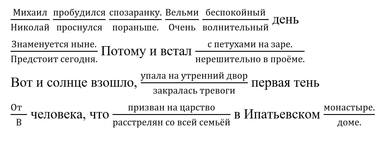 В данном случае читатель, выбирая вариант прочтения по числителю или по знаменателю, становится свидетелем одного дня из жизни первого или последнего Российского царя. Читатель также может перемешать их судьбы, если выберет свой собственный маршрут движения текста в данном стихотворении, не опираясь на варианты, предложенные автором.