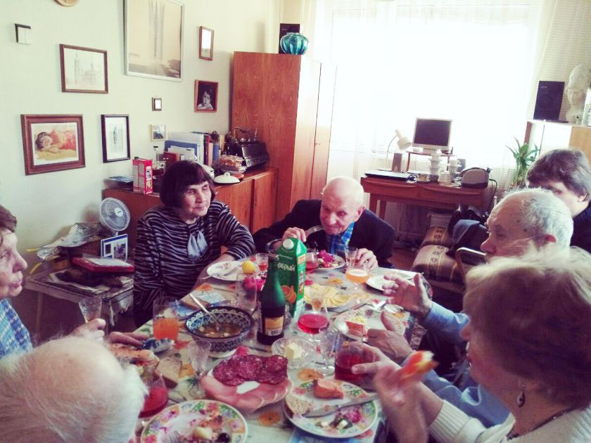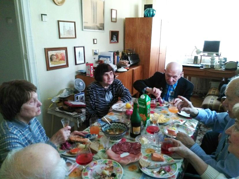 И вот мы в гостях, опять все вместе. Забывается, что прошло 60 лет со дня окончания института. Прикосновения рук, неожиданные слёзы на глазах. А ещё говорят, что невозможно вернуться в прошлое. В эту минуту мы были там. И перед тем, как садиться за стол, сфотографировались на память.