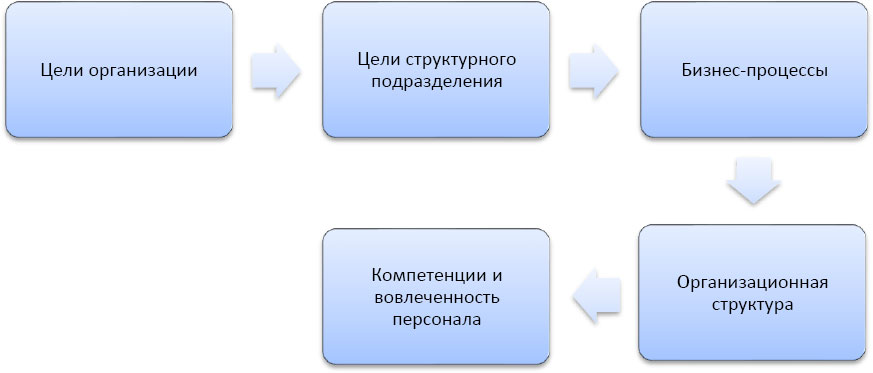 Для того чтобы «наладить» работу отдела и повысить его эффективность, нам необходимо было четко понимать цели структурного подразделения (которые, разумеется, вытекают из целей организации), затем выделить бизнес-процессы, в которых участвует структурное подразделение, разграничить зоны ответственности в рамках организационной структуры, определить необходимые компетенции персонала и сплотить сотрудников вокруг достижения организационных целей.