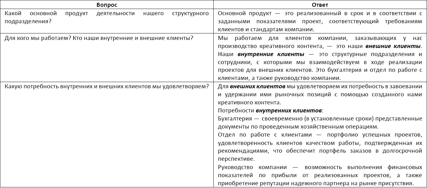 Как мы уже отметили ранее, на высококонкурентном рынке давно уже недостаточно просто удовлетворять потребности клиентов, необходимо предвосхищать их желания. Особенно это актуально для рынка услуг по созданию чего-то нового, нестандартного, как, например, создаваемый нами креативный контент. Развитие спроса клиентов с тем, чтобы предоставить им больше возможностей для процветания их бизнеса, является необходимым условием для сохранения рыночных позиций нашей компании. Поэтому применение продуктного подхода позволило представить результаты труда структурного подразделения в виде конкретных выходов – продуктов, удовлетворяющих требованиям наших внешних клиентов (заказчиков), которые будут оплачивать произведенные нами услуги (креативный контент), и критериям наших внутренних клиентов (внутренних заказчиков), которые будут «приобретать» результаты нашей работы на внутреннем «организационном рынке».