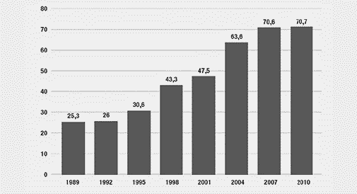 Уровень семейного долга тоже повышаетсяСтолкнувшись со стагнацией доходов и ростом цен на товары первой необходимости, семьи все больше залезают в долги. Медианная долговая нагрузка выросла почти в три раза, с 25,3 тысячи долларов в 1989 году до 70,7 тысячи долларов. Величина долга типичной семьи в 2010 году составила 154 процента ее годового дохода. В 1989 году этот показатель составлял всего 58 процентов.