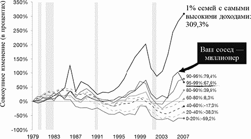 О: – Да. Этот график рассказывает историю двух разных типов богатых людей. Как видите, действительно богатые (1 процент всех американцев) стали невероятно богатыми – с 1979 года их доходы выросли на 309 процентов.