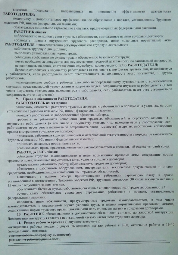 Обязательно должен быть прописан в договоре порядок предоставления вам льгот, отпусков, мед обслуживания. Также должно быть описание вашего рабочего места, продолжительность рабочего дня и график работы.