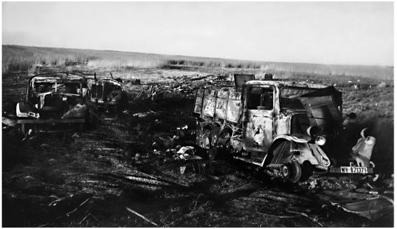 Картины поражений похожи друг на друга. Разбитые немецкие автомашины в Белоруссии летом 1944 г.
