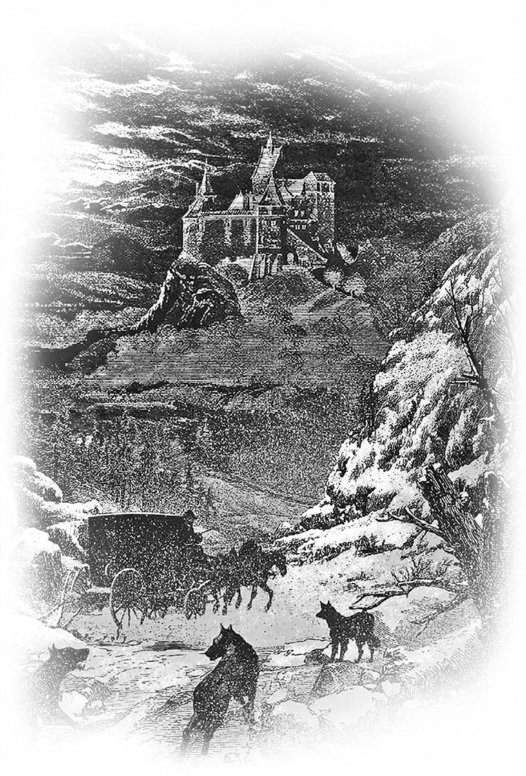 Когда луна выглянула снова, я увидел кучера, взбиравшегося на сиденье; а волков и след простыл. Все это было так странно и необычайно, что я почувствовал безумный страх и боялся говорить и двигаться. Время тянулось бесконечно. Дальнейшее путешествие мы продолжали уже в совершенной тьме, так как проносившиеся облака совсем скрывали луну. Мы продолжали подниматься в гору, только изредка периодически спускались, но потом опять все время поднимались. Я не помню, сколько времени это продолжалось…