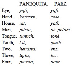 The Paezes live on both slopes of the central Cordillera, across the valley of the Magdalena from Bogota, some two thousand in number, in twenty-one villages. They prefer the high altitudes, and are a hardy set of hunters and mountaineers. In spite of the cold they go nearly naked, but what is rare among native Americans, they wear a hat of reeds or bark, resembling in this some Peruvian tribes. Nor are they devoid of skill in hammering gold into ornaments, and weaving fibres of the maguey into mats and cloths. One of their peculiar customs is to burn down a house whenever a birth or a death takes place in it. The harsh dialect they speak has been rendered accessible by a publication of Señor Uricoechea. Its practical identity with the Panequita is obvious from the following comparison:254