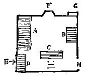 Here's your letter first thing in the morning, while I'm sipping my coffee in the midst of such confusion as I've not often achieved at my best. The little room, which I think is as nearly as possible the size of your study, but with a lower roof, has to begin with—A, my bed; B, my basin stand; C, my table; D, my chest of drawers; thus arranged in relation to E, the window (which has still its dark bars to prevent the little boy getting out); F, the fireplace; G, the golden or mineralogical cupboard; and H, the grand entrance. The two dots with a back represent my chair, which is properly solid and not un-easy. Three others of lighter disposition find place somewhere about. These with the chimney-piece and drawer's head are covered, or rather heaped, with all they can carry, and the morning is just looking in, astonished to see what is expected of it, and smiling—(yes, I may fairly say it is smiling, for it is cloudless for its part above the smoke of the horizon line)—at Sarah's hope and mine, of ever getting that room into order by twelve o'clock. The chimney-piece with its bottles, spoons, lozenge boxes, matches, candlesticks, and letters jammed behind them, does appear to me entirely hopeless, and this the more because Sarah, 45 when I tell her to take a bottle away that has a mixture in it which I don't like, looks me full in the face, and says "she won't, because I may want it." I submit, because it is so nice to get Sarah to look one full in the face. She really is the prettiest, round faced, and round eyed girl I ever saw, and it's a great shame she should be a housemaid; only I wish she would take those bottles away. She says I'm looking better to-day, and I think I'm feeling a little bit more,—no, I mean, a little bit less demoniacal. But I still can do that jackdaw beautifully.