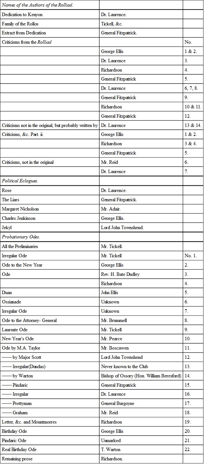 The subjoined list of the authors of The Rolliad, though less complete than I could have wished, is, I believe, substantially correct, and may, therefore, be acceptable to your readers. The names were transcribed by me from a copy of the ninth edition of The Rolliad (1791), still in the library at Sunninghill Park, in which they had been recorded on the first page of the respective papers.