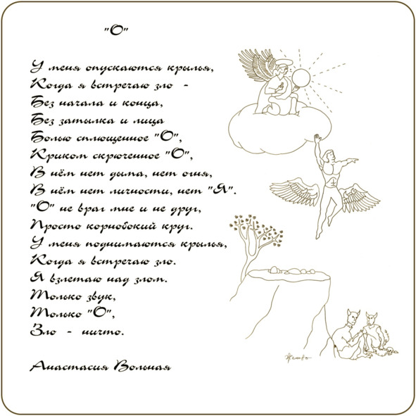 Танец камнейРастущих и слышащих.Трель, как капельДолины невидимой.Долины-страныЖивущих и дышащих.Страны человеческой птичьей и змеевой.И город там есть страждущих, жаждущих.И облако есть вечно смеющихся.Пасутся там кони, что звёздами кажутсяКони молящихся, ищущих, льющихся.И мальчик Иисус алым маком рождается.И Бог Иисус солнцем жизни возносится.Светом и разумом день озаряется.Вечер в камин башмачком опускается.Ива-печальница к озеру клонится.Струями неба, громами, вёснамиВетрА, купола да кресты позолоченыХрама камней растущих и слышащих.1994 год