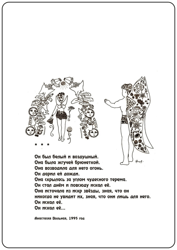 Чёрные абрисы.Белые тени.Углем и мелом.Духом и телом.Двойственны образы,Двойственен генийИной, вдохновенной,Мгновенной вселеннойЛинийИЛивней.1999 год
