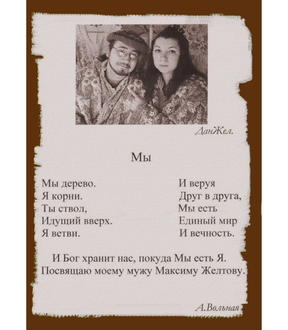 Мы есть я… Творческий союз поэта и художника, известный под названием «ДанЖел», образованный, собственно, от начала наших фамилий: Анастасия Данильченко (Анастасия Вольная – творческий псевдоним) и Максим Желтов. В тоже время в книге представлены рисунки Насти и поэтичекие работы Максима.