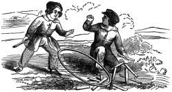 On the next day, Edgar was building a house with sticks, and William was rolling a hoop. By accident the hoop was turned from its right course, and broke down a part of Edgar's house. William was just going to say how sorry he was for the accident, and to offer to repair the damage that was done, when his brother, with his face red with passion, cried out—